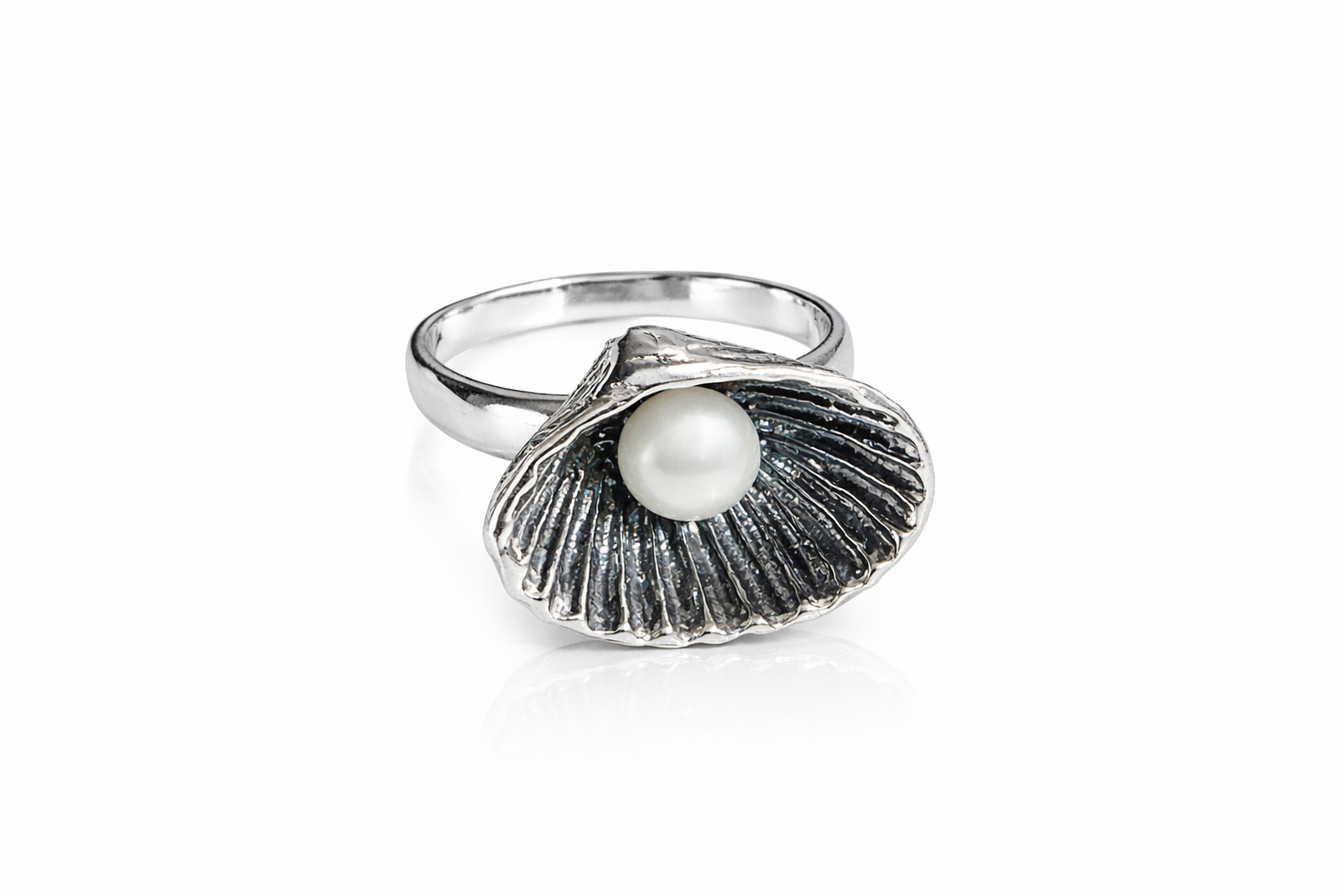 The sculptural shell setting showcases subtle grooves and depth, giving the piece an artisanal character while maintaining a clean, elegant silhouette. The contrast between the oxidized details of the shell and the smooth, polished sterling silver band enhances the dimensional look of the design.