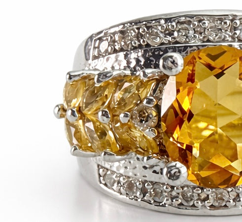 The central stone is framed by complementary faceted citrine accents along the band, enhancing the richness of color and adding visual depth to the design. Pavé-style clear stones are set into the silver shoulders, providing a refined contrast and subtle sparkle that elevates the overall composition.